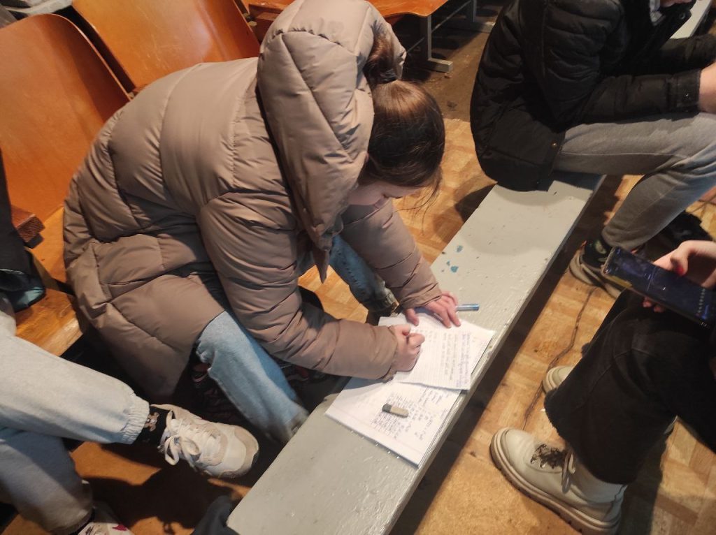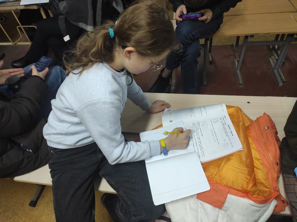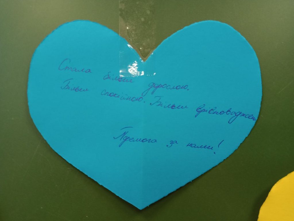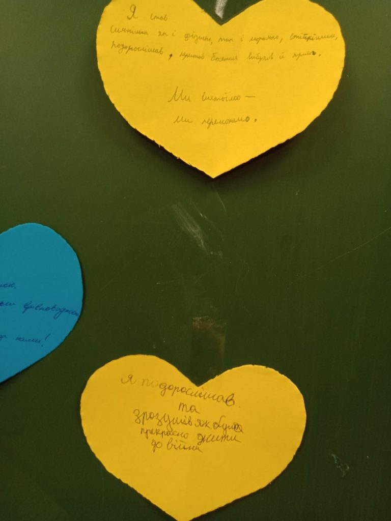 Здається, в перші години час зупинився… Але українці виявилися значно сильнішими, дружнішими, витривалішими, ніж про нас думав увесь світ. Ми навчилися вчитися, вчити, допомагати, ми навчилися жити навіть у таких умовах. Повітряні тривоги стали постійним супроводом нашого життя. І слово «укриття» набуло іншого сенсу. Вони стали нашим порятунком. Ми навчилися там не просто пересиджувати тривогу, ми навчилися там посміхатися, адже ми там граємо в ігри, співаємо, святкуємо, вишиваємо, даємо міні-концерти, тренуємося, а іноді навіть навчаємося. А після закінчення навчального процесу, коли учні вже вдома, вчителі під час тривог здобувають вміння стріляти.