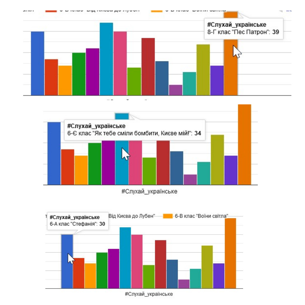 В конкурсі пісень “#Слухай_українське” 3 місце зайняли учні 6-А класу, 2 місце – учні 6-Є класу, а переможцями стали учні 8-Г класу.
