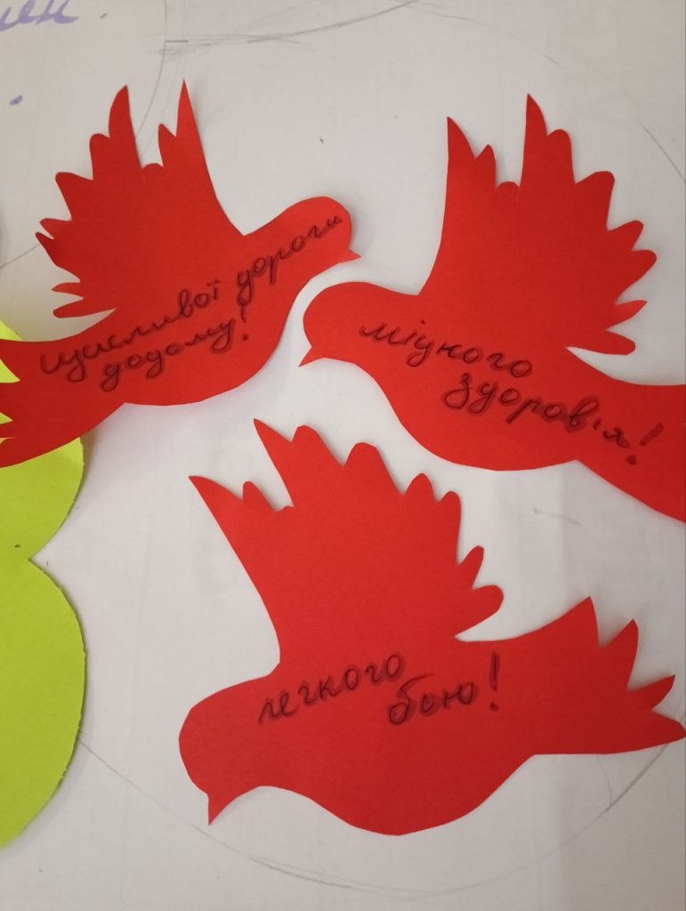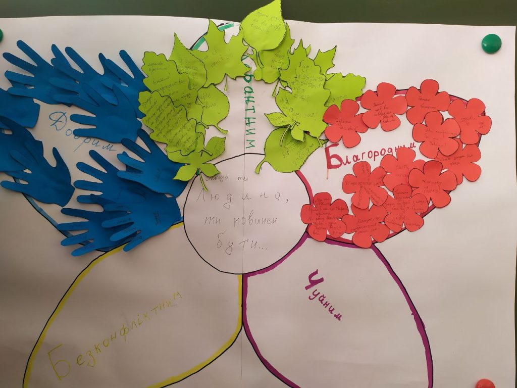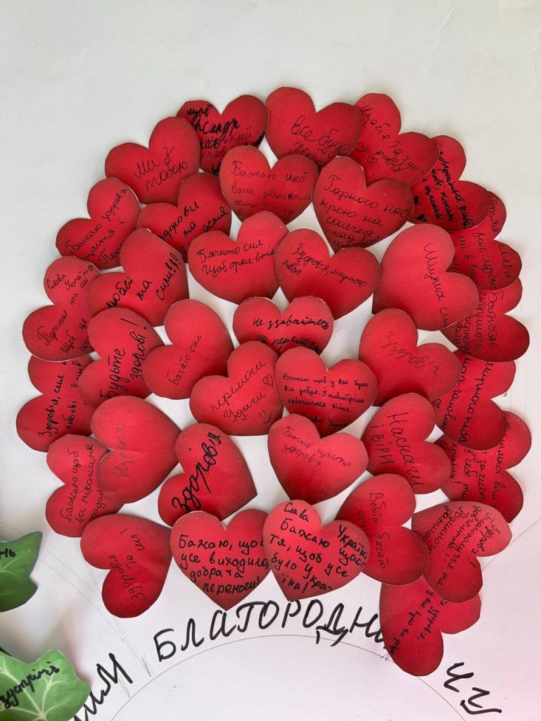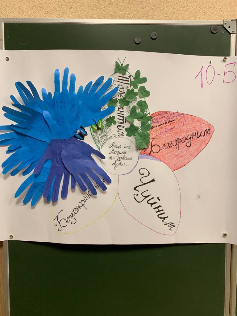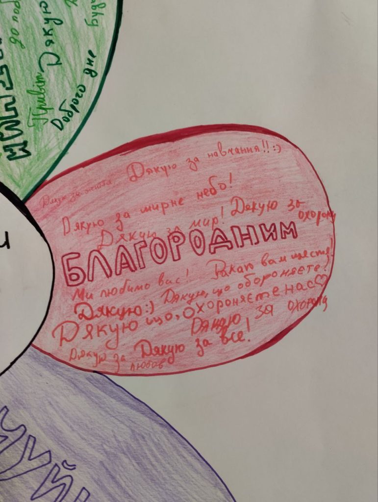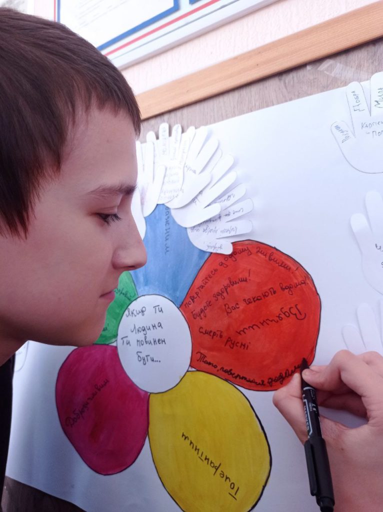 Протягом дня учні створювали малюнки та саморобки для військових, які лікуються в госпіталі. А на червоній пелюстці Квітки толерантності учні писали побажання, які хотіли б передати військовим.